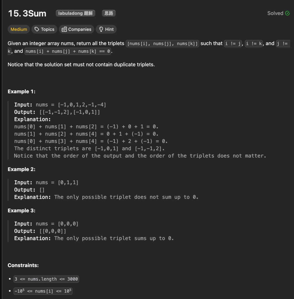 这道题可以说是昨天Leetcode11 2Sum的变体,本质上的思想还是用到了two pointers,但是需要注意的是,这道题的特殊情况是不能有重复,所以我们需要加一下限制条件。
