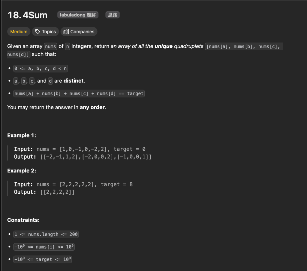 在上面的3Sum 我们看到 实际上可以把问题转化为2Sum来解决,那么针对4Sum,我们可以先变成3Sum,再变成2Sum,这就是递归的思想了,所以很快 ,我就有了这样一个思路。