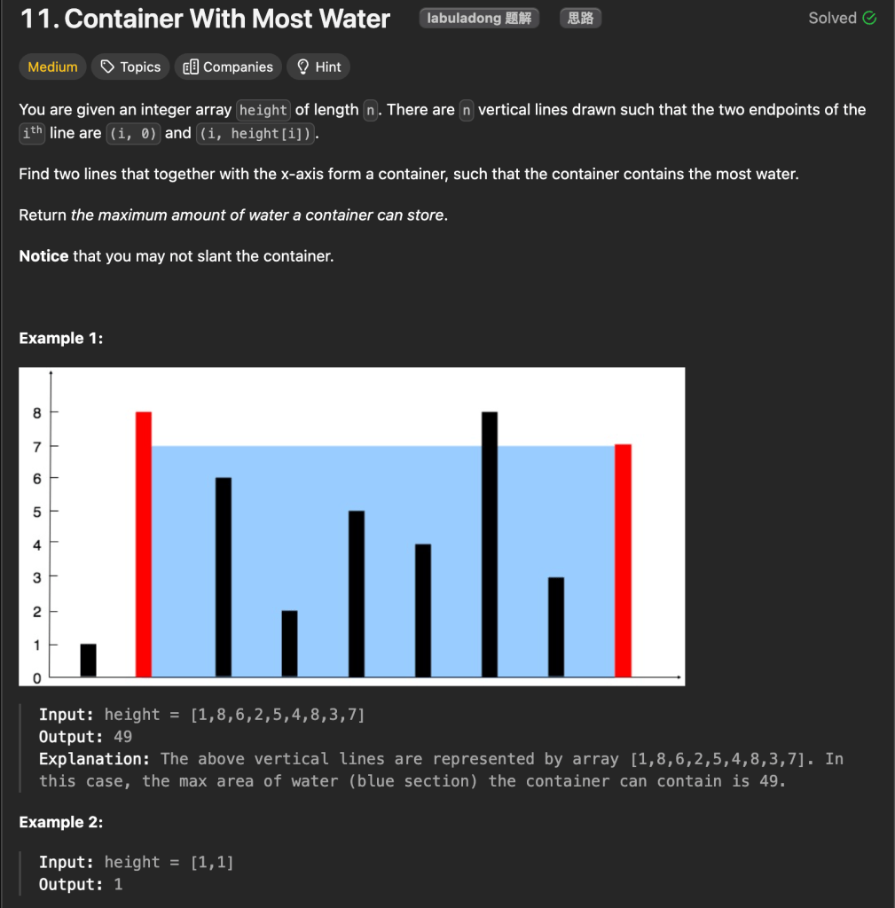 这道题也是很有趣,由于长时间没有做题,我的第一反应是dp,但是仔细一想便觉得dp应该是完全不可能的,因为他的父问题本质上没有办法拆分为子问题,即使定义了状态,状态转移方程也不易构建。其次dp的时间复杂度可能达到 O(n²)。所以马上就想到了用贪心算法来实现double pointers,实现也是非常简单。我们在一开始将双指针初始化于数组两端的,确保初始时容器的宽度最大。随后,每次移动较短板对应的指针,尝试找到更高的板,增加容器的高度,从而可能增加容量。这种策略在每一步都做出局部最优选择,最终达到全局最优解。这种方法通过在每一步选择当前最优解,期望最终获得全局最优解。